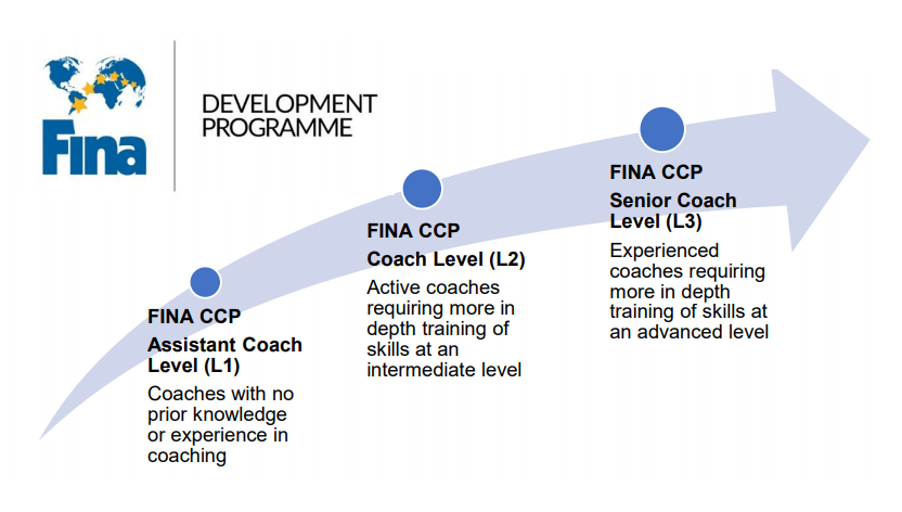 FINA의 경영 지도자 코스는 총 3단계( 보조코치 ▶ 지도자 ▶ 선임 지도자 과정)로 진행되며, 앞 단계 수료자만 다음 단계 교육 과정에 지원 가능합니다.