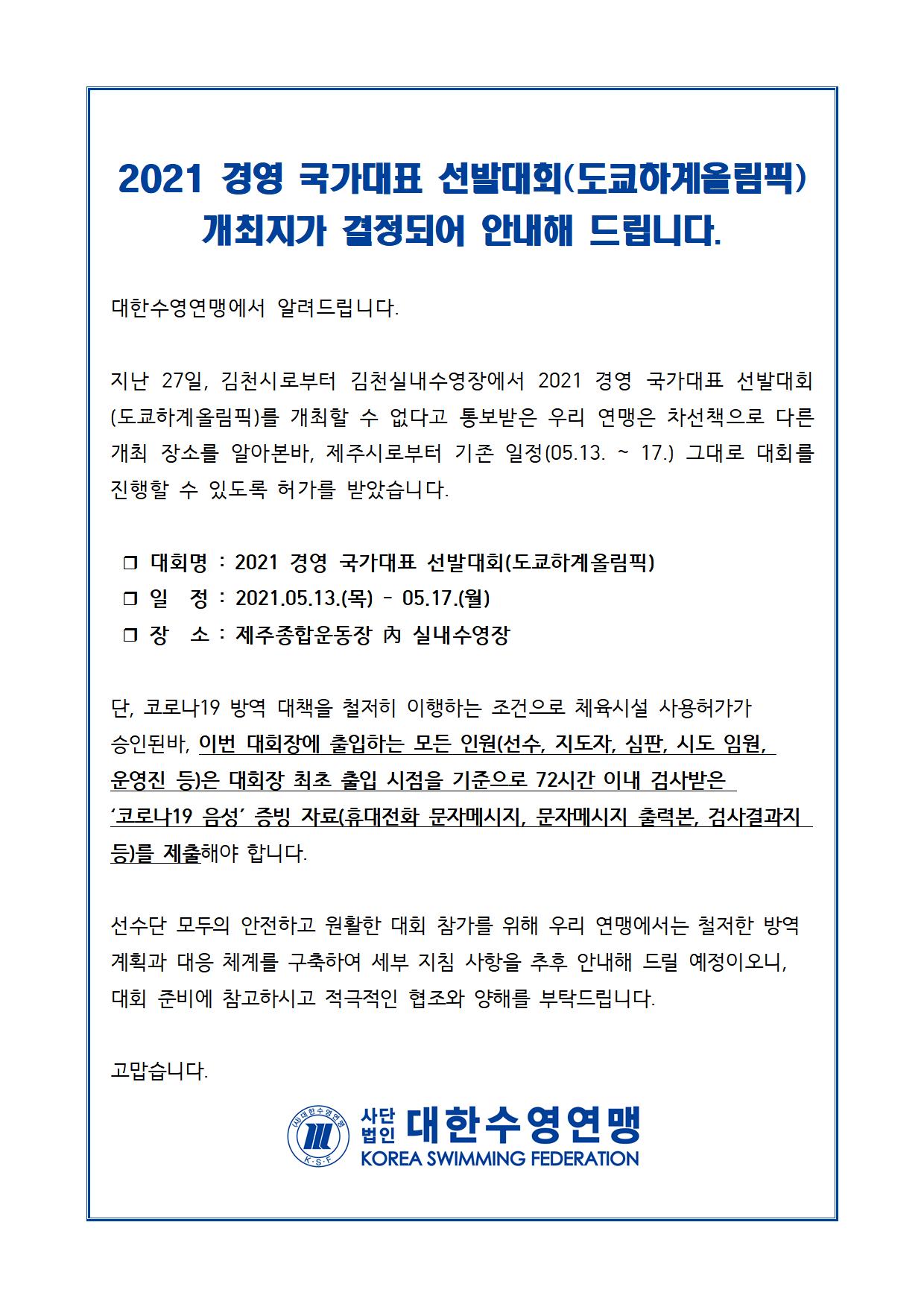 | 2021 경영 국가대표 선발대회(도쿄하계올림픽) 개최 관련 진행 상황 (0) | 2021.04.30 |